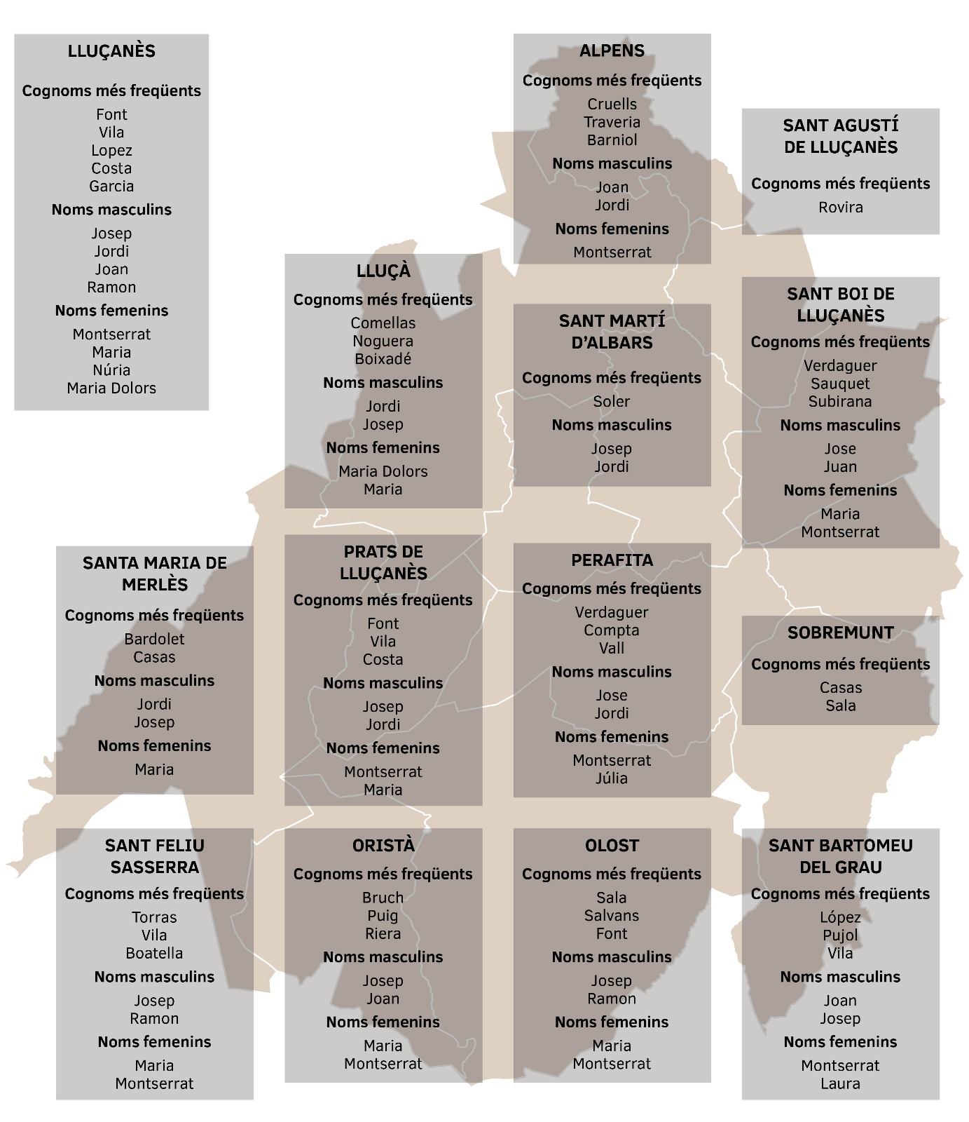 Pel que fa als noms de dona Montserrat i Maria són, de bon tros, els que més es repeteixen, seguits, a distància, de les Núries i les Maria Dolors. Si ho comparem amb les comarques veïnes — Osona, al Moianès i al Bages—, les Montserrats també encapçalen la llista. Al Ripollès i al Berguedà, el primer lloc se l’emporten les Maries. Pel que fa a la freqüència del primer cognom, Font encapçala la llista al Lluçanès, seguit dels Vila (o Vilà) i dels López. Crida l’atenció que, a Catalunya, el primer cognom més comú és Garcia; en canvi, al Lluçanès aquest ocupa el cinquè lloc. Aquest fet només passa a cinc altres comarques: la Vall d’Aran (Rodríguez), el Pallars Jussà (Sánchez), les Garrigues (Sans), el Priorat (Masip) i la Terra Alta (Llop). Pel que fa a la distribució per municipis, podeu veure els resultats a les taules del costat. Cal tenir en compte que en el cas de Sant Agustí i Sobremunt, no hi ha freqüència de noms perquè són municipis molt petits. En el cas de Sant Martí, on no apareix cap nom de dona, és perquè no n’hi ha cap que es repeteixi més de cinc vegades. Cal puntualitzar que les dades de l’INE diferencien entre noms en funció de si són en català o castellà; per exemple, Maria i María (la variant castellana) no es consideren estadísticament el mateix nom. Per tant, potser hi ha cinc Maries, però no s’escriuen igual.