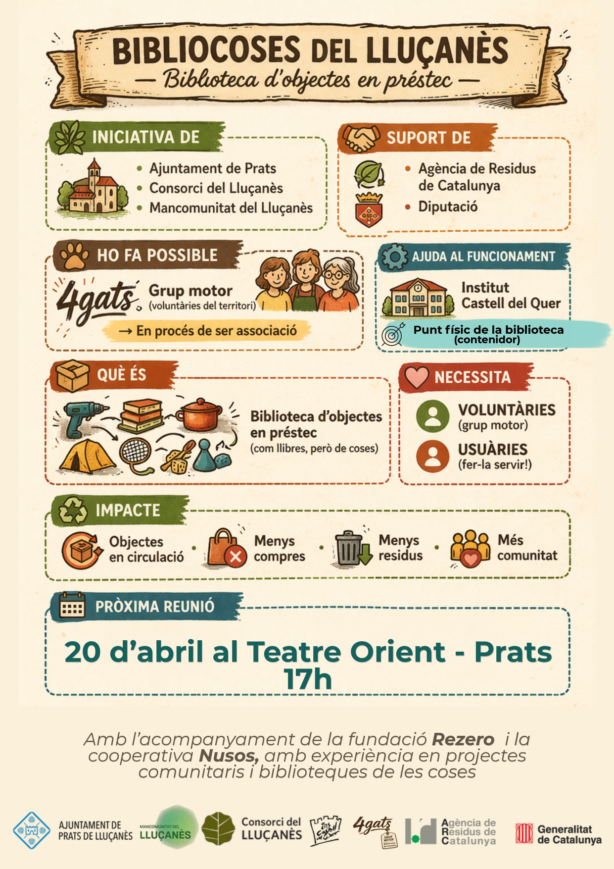 Aquest projecte, impulsat per l’Ajuntament de Prats, el Consorci i la Mancomunitat del Lluçanès, amb l’acompanyament de Nusos Cooperativa i la Fundació Rezero, i dissenyat i animat per un Grup Motor de persones voluntàries, demana mans, energia i voluntat per poder veure la llum. Són moltes les persones que estan esperant amb moltes ganes que s’engegui per apuntar-s’hi, i això ja és una bona llavor.